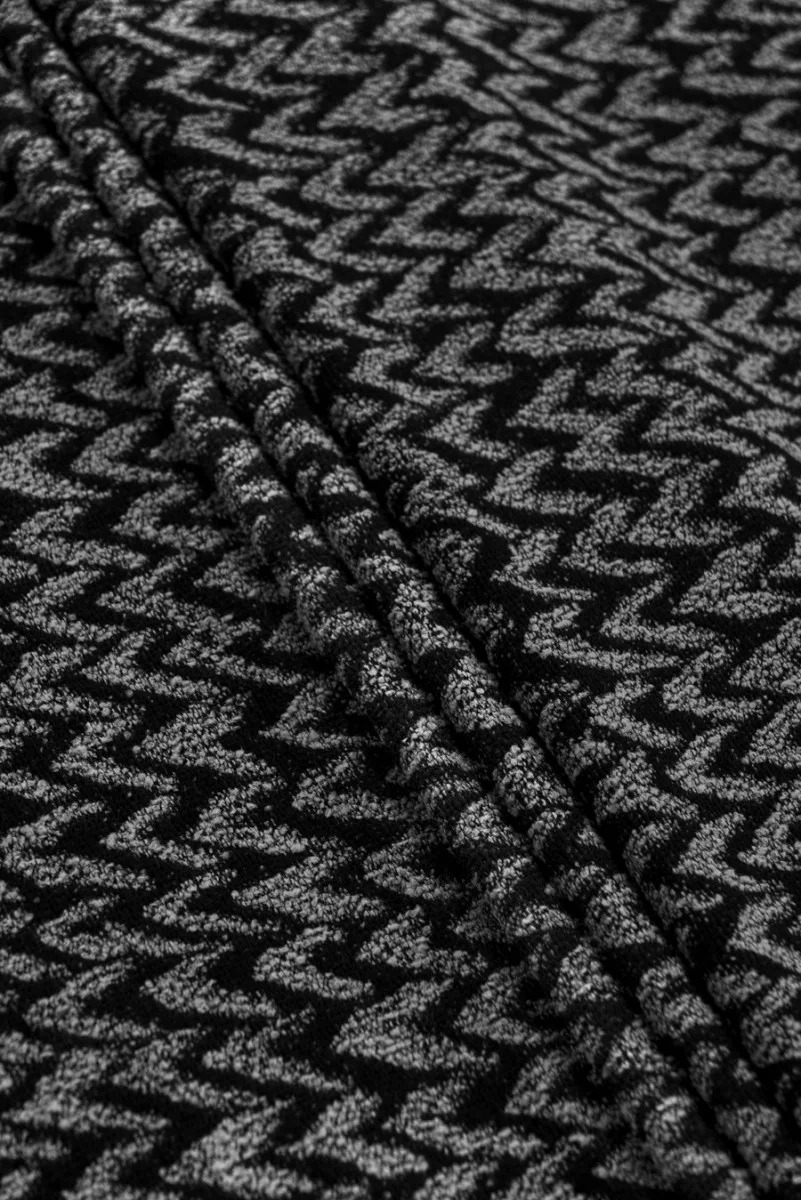 Włoska tkanina kostiumowa w czarno-szare nieregularne zygzaki, utkana z wełny naturalnej z domieszką poliestru.