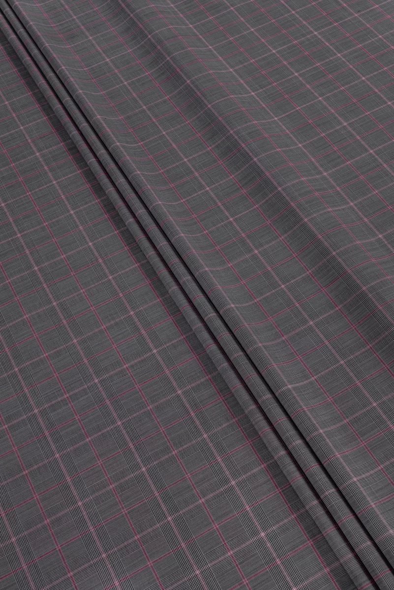 Włoska wełna kostiumowa w kolorze szaro-czarnym z motywem różowej kratki (3,5 cm). Tkanina miękka o klasycznej grubości - idealna do uszycia garnituru, kostiumu, sukni, spódnicy lub spodni.
