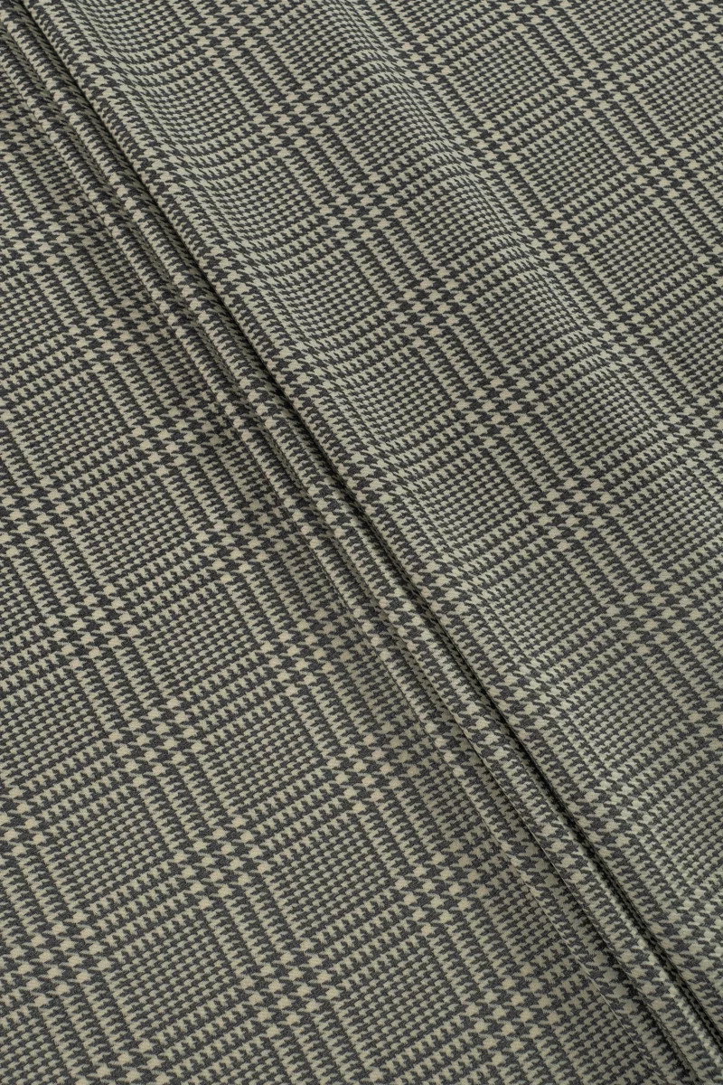 Włoska wełna kostiumowa o splocie diagonalnym (skośnym) z motywem kratki oraz kurzej stopki w kolorze écru z szarością. Tkanina grubsza, mięsista z gatunku jesienno-zimowych.