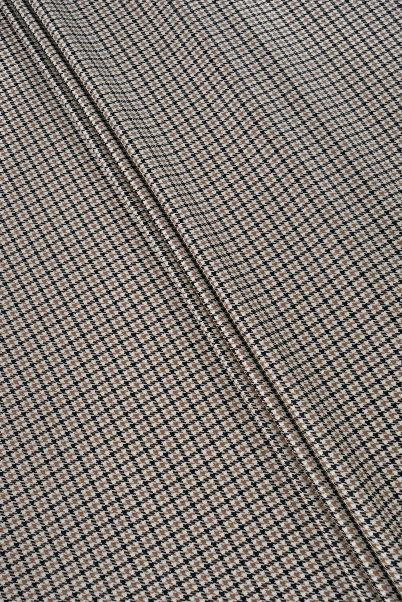Włoska wełna kostiumowa w kolorze jasnego beżu z drobnym motywem kratki i pepitki (2 cm)w kolorze ciemnego brązu i kamelu. Tkanina grubsza, nieelastyczna, mięsista z gatunku jesienno-zimowych.