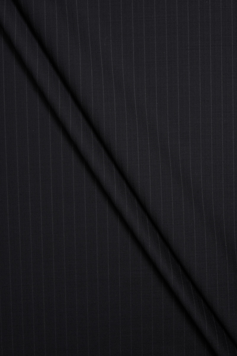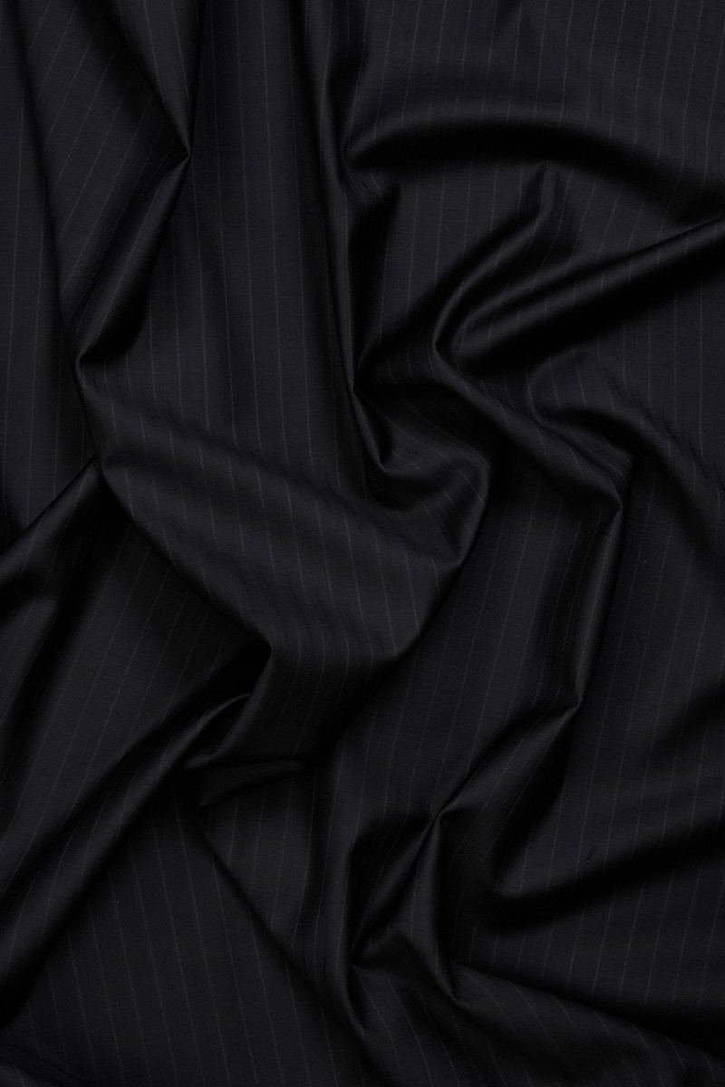 Włoska tkanina kostiumowa utkana z wełny i jedwabiu w kolorze czarnym w cienkie szare oraz czarne paski. Paski są rozmieszczone naprzemiennie co 5 mm. Tkanina jest miękka, mięsista, nieelastyczna oraz ma piękny połysk. Idealna na uszycie kostiumu, garnituru, spodni, spódnicy, sukienki.