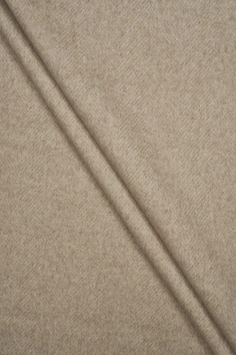 Włoska tkanina płaszczowa, mieszanka wełny z poliamidem z motywem delikatniej jodełki w kolorze jasnego beżu. Tkanina jest mięsista, miękka, nieelastyczna. Idealnie sprawdzi się na okrycia wierzchnie takie jak płaszcz, kurtka, kamizelka.