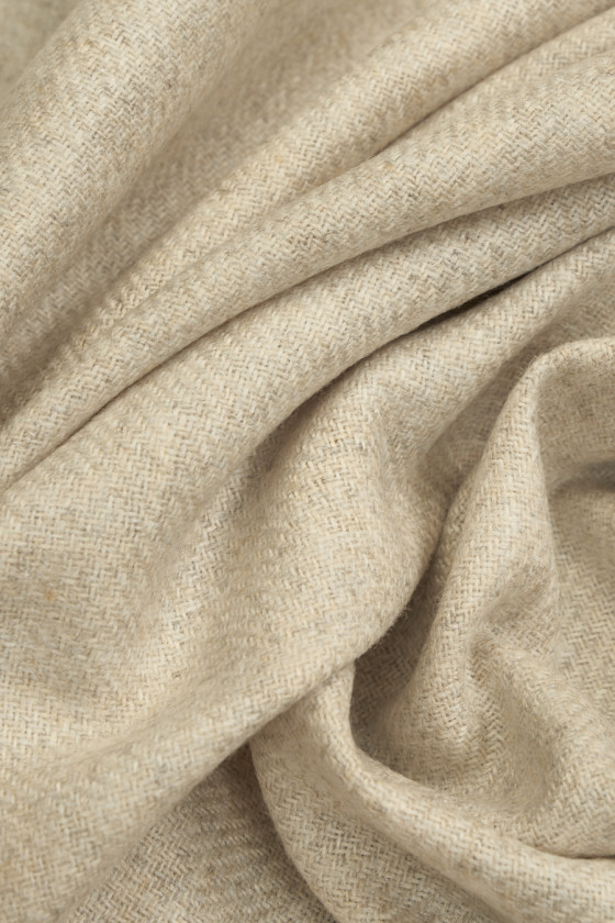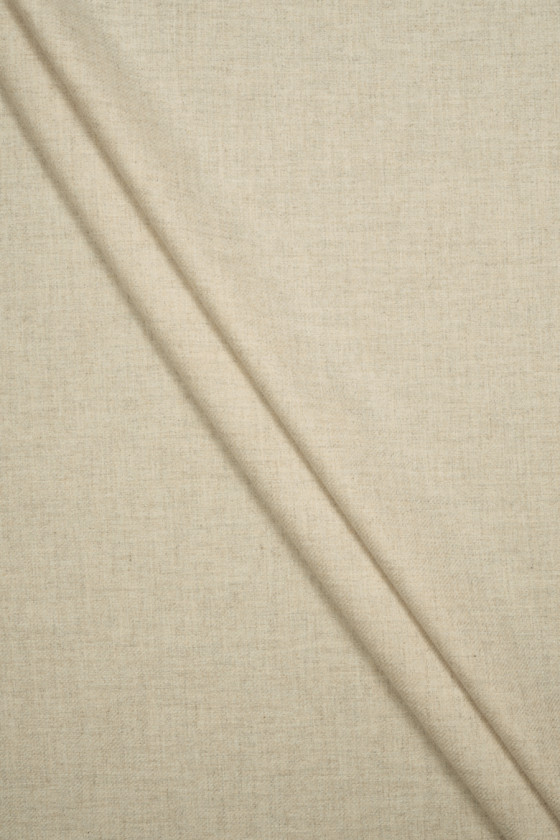 Włoska tkanina kostiumowa w kolorze jasnym beżowym. Tkanina jest średniej grubości, bardzo przyjemna w chwycie, miękka i nieelastyczna, dodatek wełny sprawia, że materiał jest ciepły. Klasyczna propozycja w pięknym odcieniu beżu, która sprawdzi się w uszyciu jesiennych sukienek, spódnic, marynarek oraz grubszych chust lub szali.