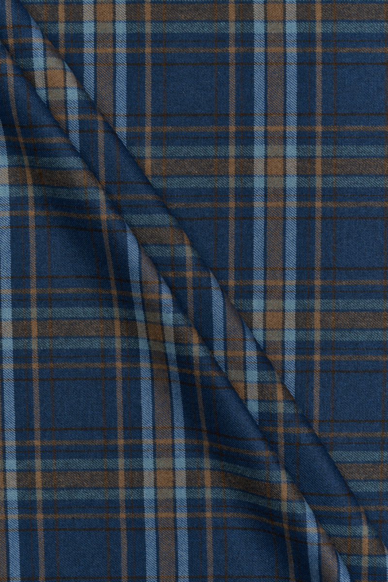 Włoska tkanina kostiumowa z jesienno-zimowej kolekcji, utkana z wełny i poliestru z motywem kraty w kolorze niebieskim oraz zgaszonym pomarańczowym. Regularny wzór większej kraty - wymiar jednego motywu to 11,5 cm * 10,5 cm. Tkanina jest średniej grubości, miękka, przyjemna w chwycie i elastyczna o gładkim splocie. Ponadczasowa propozycja, która doskonale sprawdzi się w uszyciu spódnicy, sukienki a także spodni i marynarki.