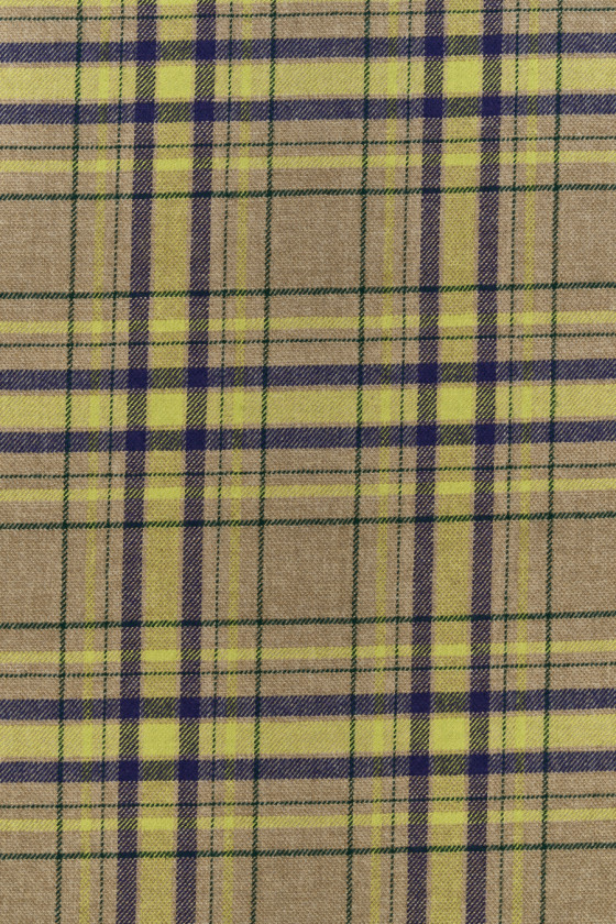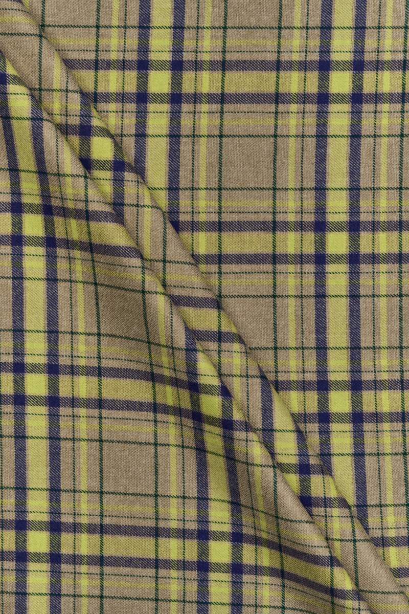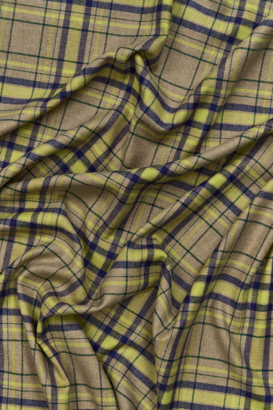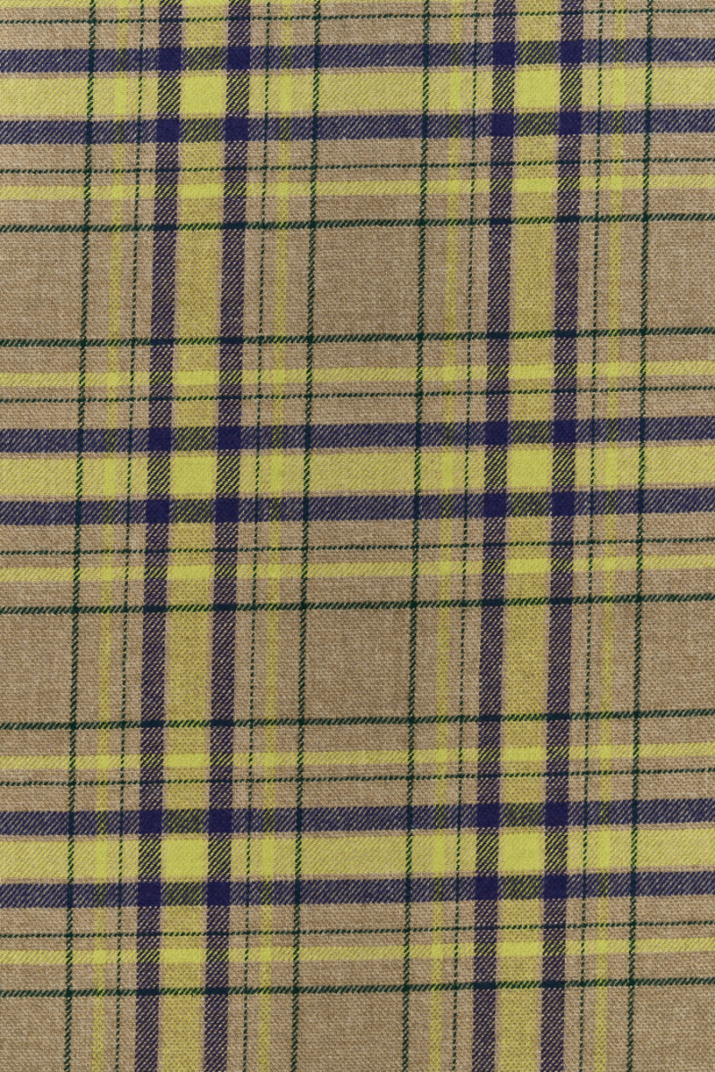 Włoska tkanina kostiumowa z jesienno-zimowej kolekcji, utkana z wełny i poliestru z motywem kraty w kolorze ciepłego beżu oraz fioletu i limonki. Regularny wzór większej kraty - wymiar jednego motywu to 12 cm * 11 cm. Tkanina jest średniej grubości, miękka, przyjemna w chwycie i elastyczna o gładkim splocie. Ponadczasowa propozycja, która doskonale sprawdzi się w uszyciu spódnicy, sukienki a także spodni i marynarki.