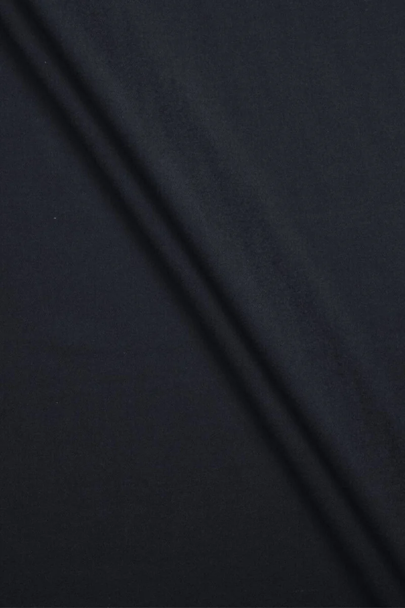 Włoska tkanina kostiumowa wykonana z wełny naturalnej z domieszką poliamidu w kolorze bardzo ciemnego granatu. Materiał ma delikatnie skośny splot, jest średniej grubości z gatunku przypomina flanelę. Idealnie sprawdzi się do uszycia jesienno-zimowych ubrań typu: suknia, spódnica lub spodnie. Fantastyczna propozycja dla osób ceniących dobre gatunki tkanin.