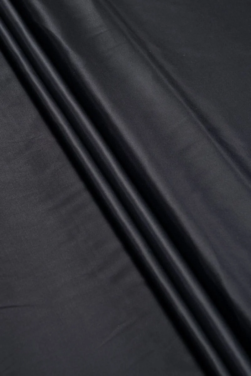 Włoska tkanina kostiumowa wykonana z wełny naturalniej z domieszką jedwabiu w kolorze ciemnego granatu. Tkanina jest nieelastyczna, cienka o gładkim, satynowym splocie. Naturalna tkanina dla osób lubiących klasyczne kolory.