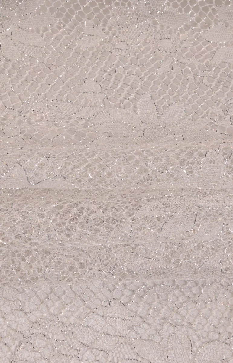 Delikatna koronka francuska w kolorze jasno-szarym ze srebrnym lureksem o szerokości 35 cm. Koronka z jednej strony wykończona ozdobnym zębem. Polecamy ja jako wstawki lub wykończenia eleganckich kreacji.
