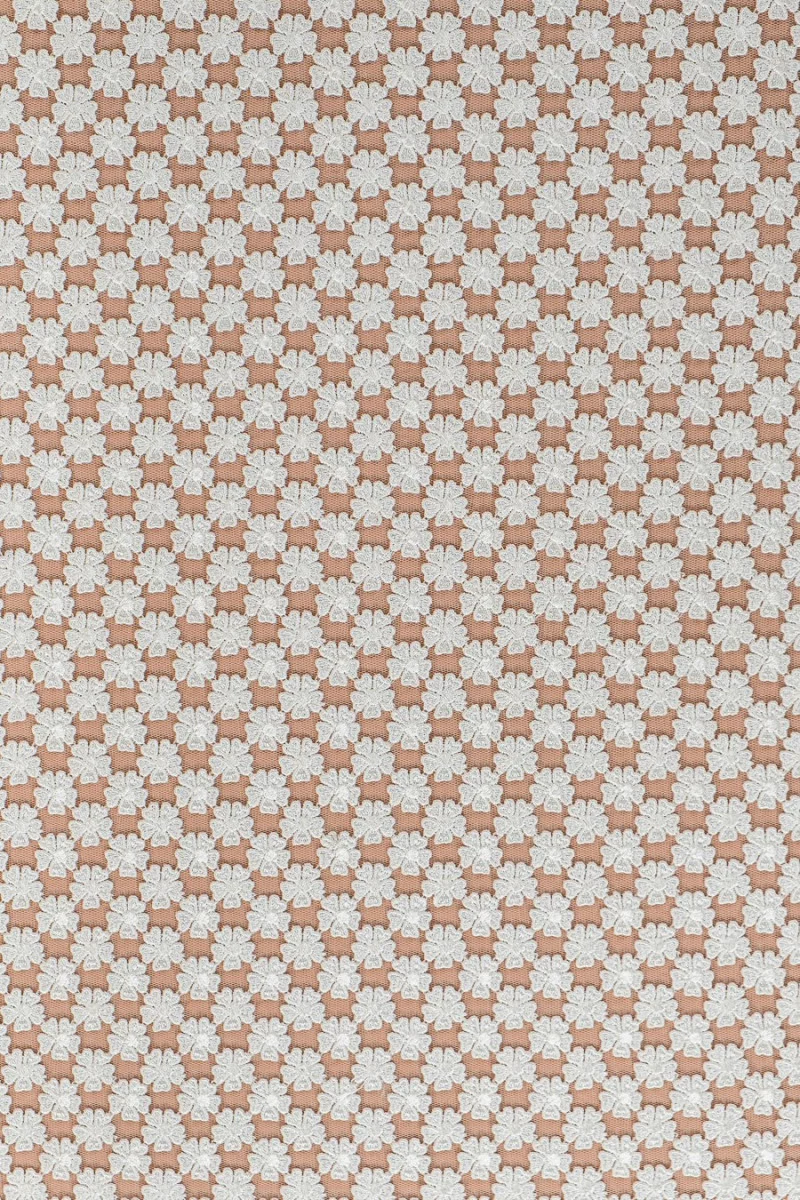 Włoska koronka ślubna w kolorze écru - motyw drobnych kwiatków (1,5 cm) naszytych na jedwabnej organzie, która nadaje sztywności. Koronka ma szerokość 130cm a sam wzór jest bardzo gęsty i ma szerokość 125cm.