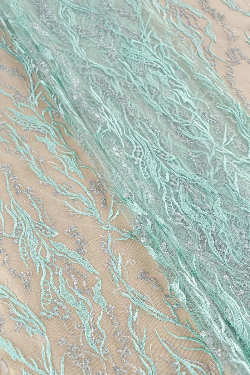 Włoski tiul haftowany motywem gałązek i drobnych kwiatów w kolorze miętowym, tkanina bardzo subtelna, pięknie ozdobiona srebrną nitką lureksową. Tkanina jest obustronnie wykończona ozdobnym zębem (do samodzielnego wycięcia) - wzór występuje obwodowo. Fantastyczna propozycja do uszycia koktajlowej sukienki, bluzki lub spódnicy.