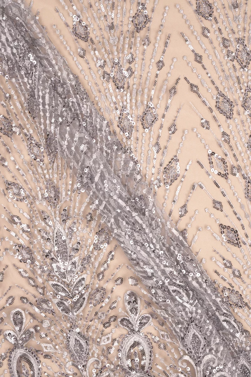 Włoska koronka bogato zdobiona koralikami oraz cekinami. Na szarym tiulu wyhaftowano ornamenty oraz wzory roślinne ozdobione koralikami i cekinami. Tkanina jest obustronnie wykończona ozdobnym zębem - szyjemy ją obwodowo. Tiul ma szerokość 155 cm a sam wzór 130 cm. Tiul ma szerokość 155 cm a sam wzór 130 cm. Koronka jest transparentna, nieelastyczna - idealna do uszycia eleganckiej bluzki, sukni lub spódnicy.