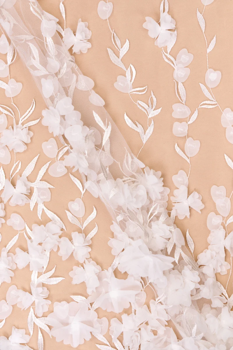 Włoska tkanina wieczorowa w kolorze śmietanowym. Na elastycznej siatce wyhaftowano listki i gałązki do których doszyto szyfonowe kwiatki w kolorze śmietanowym. Cały wzór zagęszcza się w kierunku jednego brzegu tkaniny, kwiatki lekko "odstają" tworząc efekt 3D - szyjemy ją obwodowo. Piękna propozycja dla osób lubiących oryginalne tkaniny, wspaniale sprawdzi się również na suknię ślubną.
