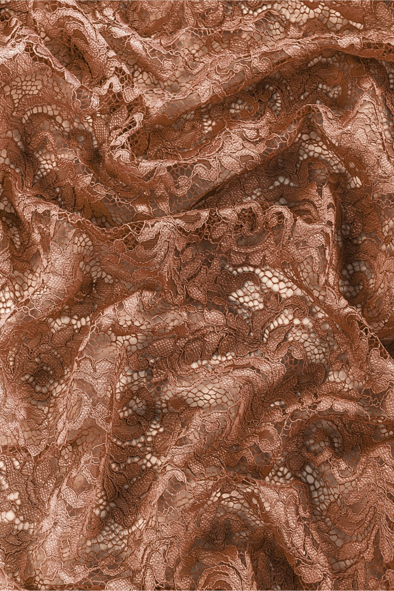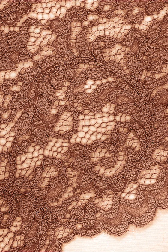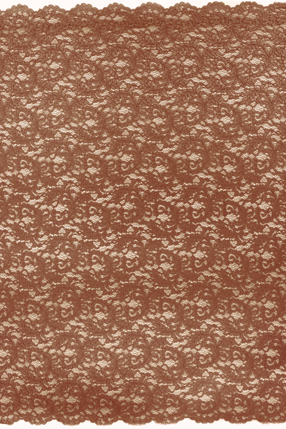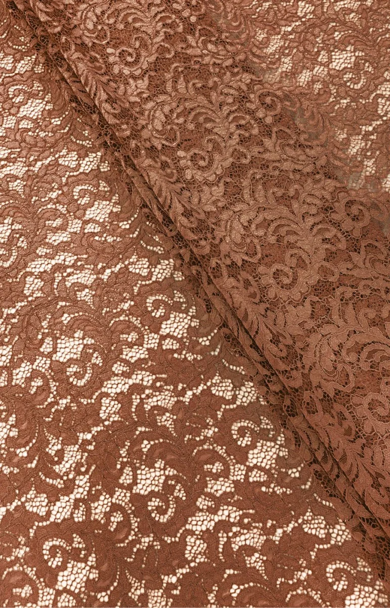 Włoska koronka w kolorze kamelowym. Tkanina ma gęsty motyw kwiatowy połączony siateczką oraz wykończony kordonkiem. Koronka z obu stron wykończona jest ozdobnym zębem - szyjemy ją obwodowo. Bardzo fajna propozycja dla osób lubiących klasyczne, ciepłe kolory.