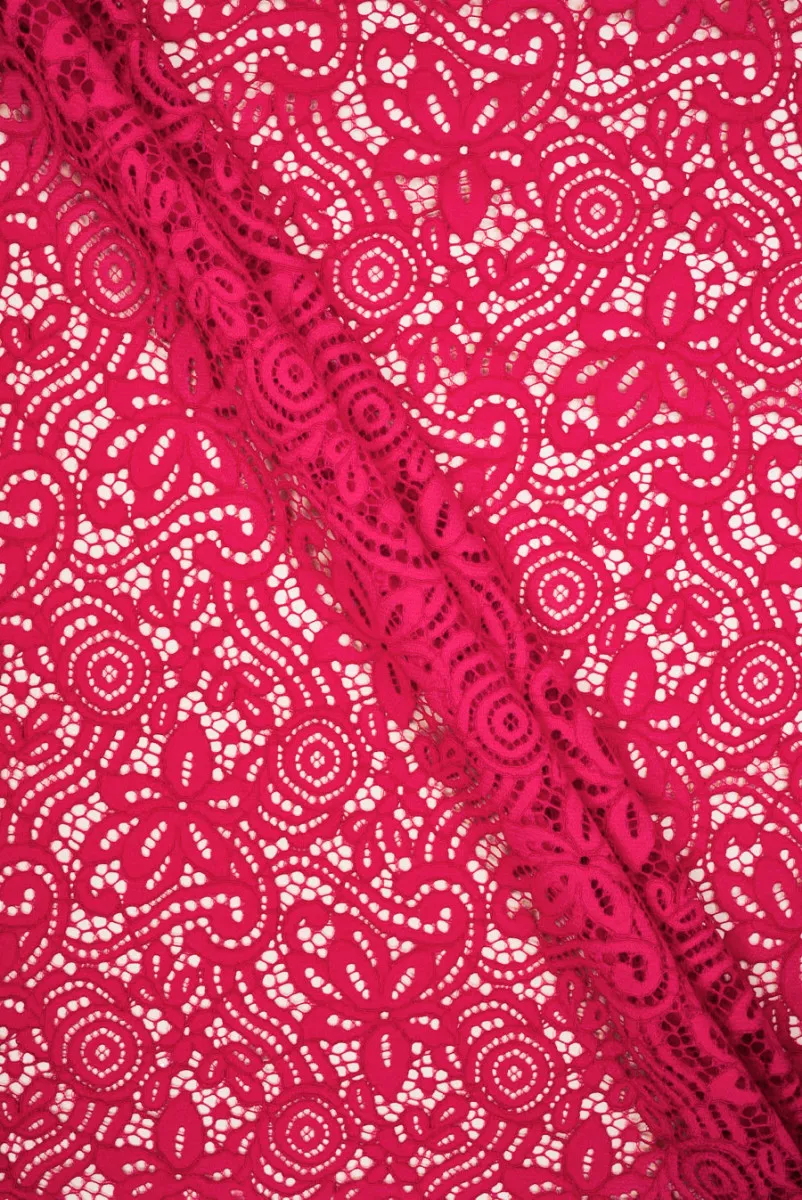 Włoska, efektowna koronka w intensywnym, nasyconym odcieniu różu, która przyciąga uwagę swoją bogatą strukturą i wyrazistym wzorem. Misterny, ażurowy deseń tworzy gęstą, ornamentalną kompozycję inspirowaną motywami roślinnymi i koronkową klasyką, nadając całości elegancki i bardzo kobiecy charakter. Tkanina została wykończona z obu stron symetrycznym, dekoracyjnym zębem, co pozwala na efektowne wykorzystanie jej krawędzi bez konieczności dodatkowego wykończenia. Materiał jest przyjemny w dotyku, nieelastyczny i dobrze układa się na sylwetce, dzięki czemu sprawdzi się zarówno w dopasowanych fasonach, jak i bardziej zwiewnych formach. Koronka doskonale nadaje się na sukienki, bluzki, spódnice czy eleganckie detale, wprowadzając do projektów nutę wyrafinowanej zmysłowości.