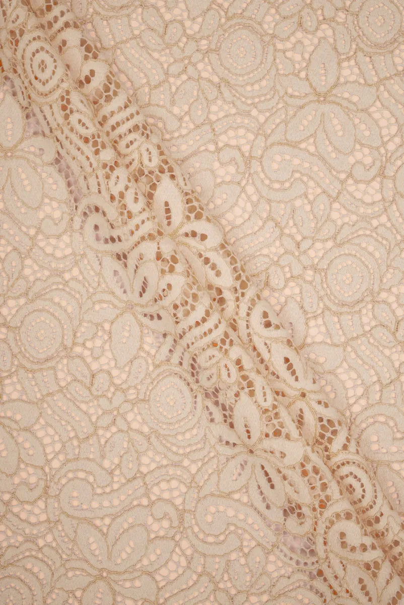 Włoska, efektowna koronka w delikatnym odcieniu jasnego beżu, która przyciąga uwagę swoją bogatą strukturą i wyrazistym wzorem. Misterny, ażurowy deseń tworzy gęstą, ornamentalną kompozycję inspirowaną motywami roślinnymi i koronkową klasyką, nadając całości elegancki i bardzo kobiecy charakter. Tkanina została wykończona z obu stron symetrycznym, dekoracyjnym zębem, co pozwala na efektowne wykorzystanie jej krawędzi bez konieczności dodatkowego wykończenia. Materiał jest przyjemny w dotyku, nieelastyczny i dobrze układa się na sylwetce, dzięki czemu sprawdzi się zarówno w dopasowanych fasonach, jak i bardziej zwiewnych formach. Koronka doskonale nadaje się na sukienki, bluzki, spódnice czy eleganckie detale, wprowadzając do projektów nutę wyrafinowanej zmysłowości.