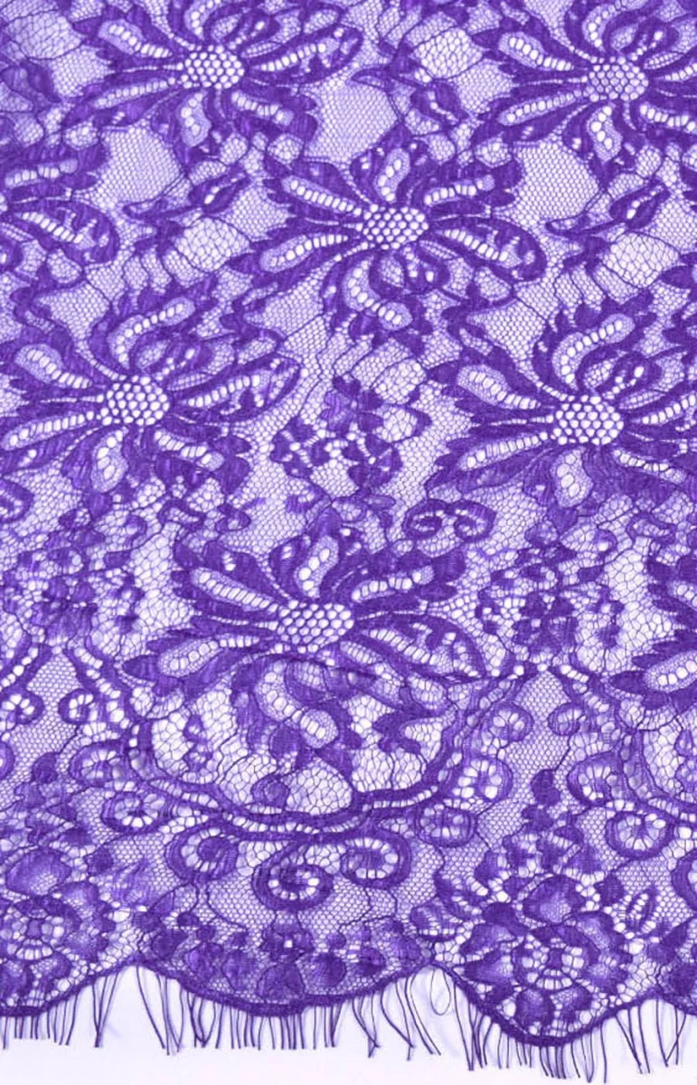 Koronka wieczorowa w kolorze fioletu, występuje w powtarzalnym kuponie o wymiarach 110 cm * 150 cm. Jednostronnie wykończona zębem, nieelastyczna.