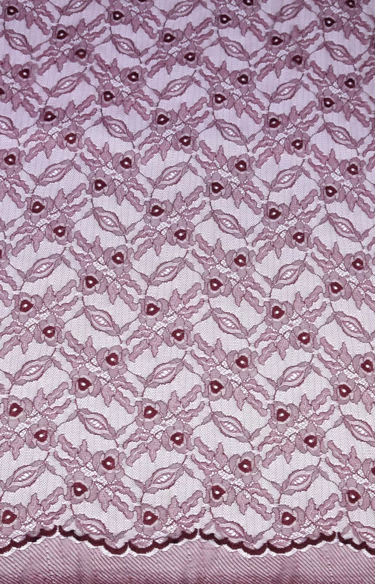 Włoska tkanina wieczorowa typu koronka w kolorze bordowym. Piękny, gęsty motyw kwiatowy, połączony drobną siateczką. Tkanina jest bardzo cienka i delikatna, z obu stron wykończona ozdobnym zębem (do samodzielnego wycięcia). Przepiękna propozycja dla osób ceniących sobie eleganckie, klasyczne tkaniny w ciemniejszej kolorystyce.