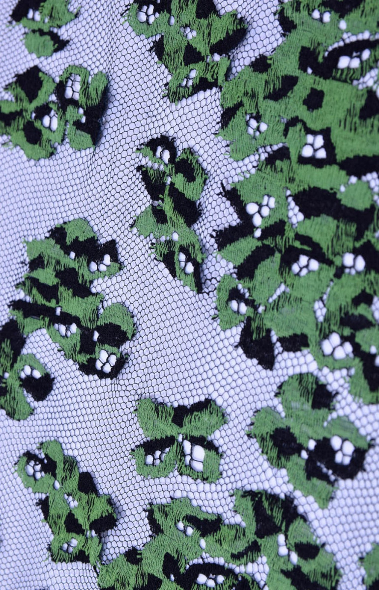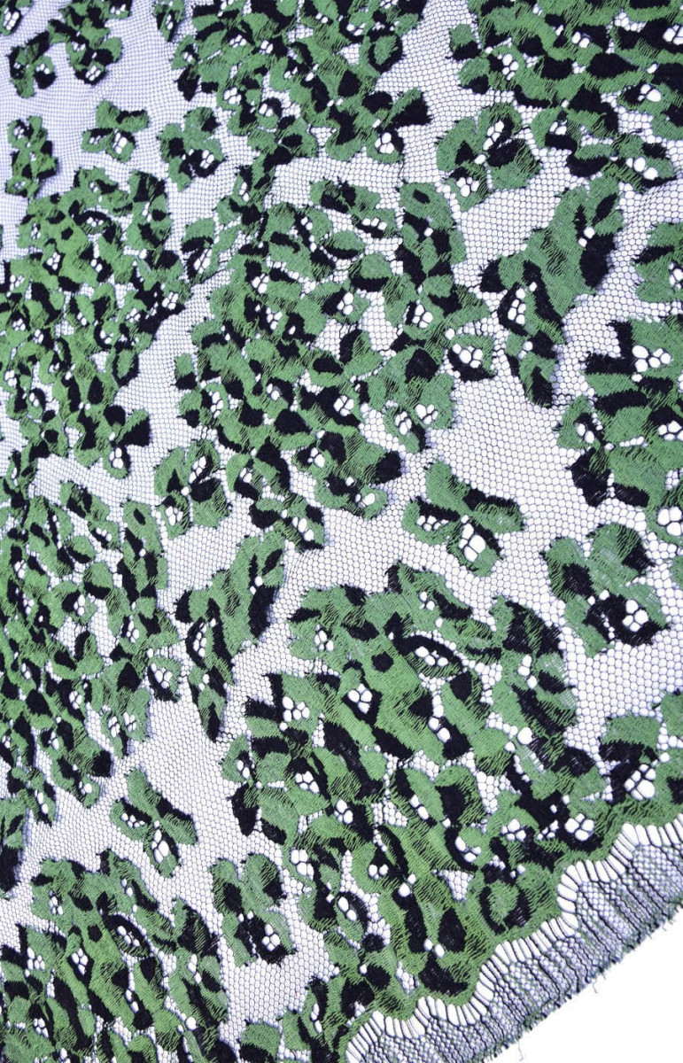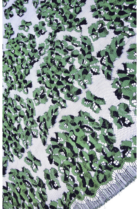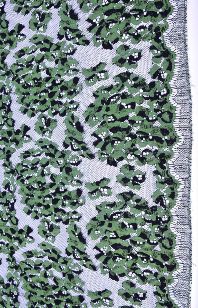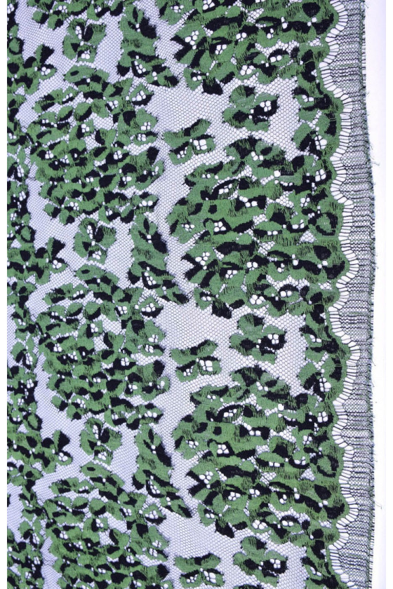 Piękna dwukolorowa( zielono-granatowa) koronka francuska z narastającym wzorem, jednostronnie wykończona zębem. Idealna na bluzeczki oraz sukienki. Polecamy kupić ją obwodowo.