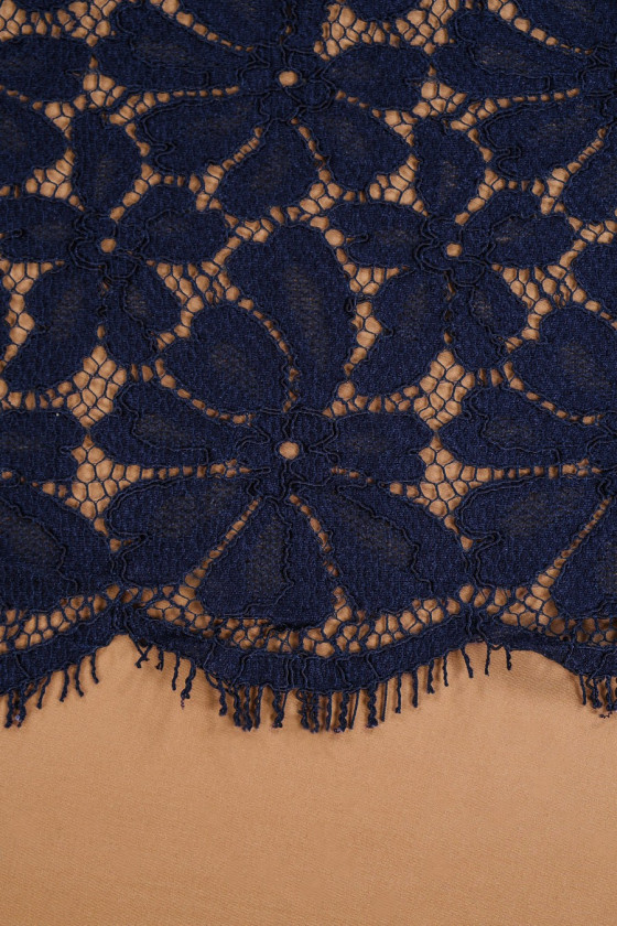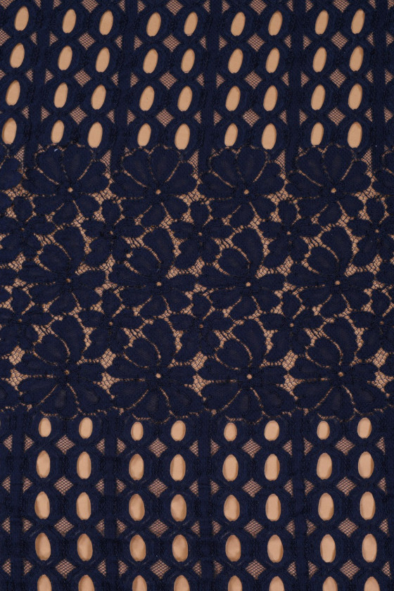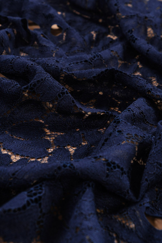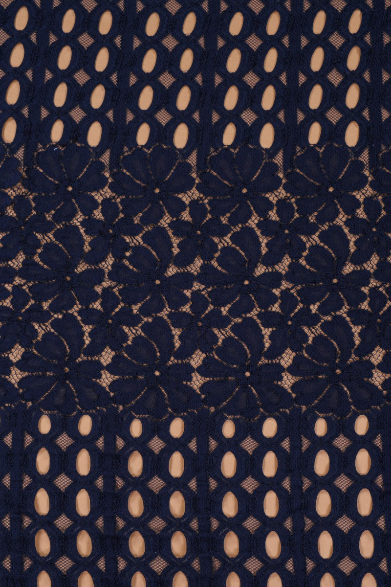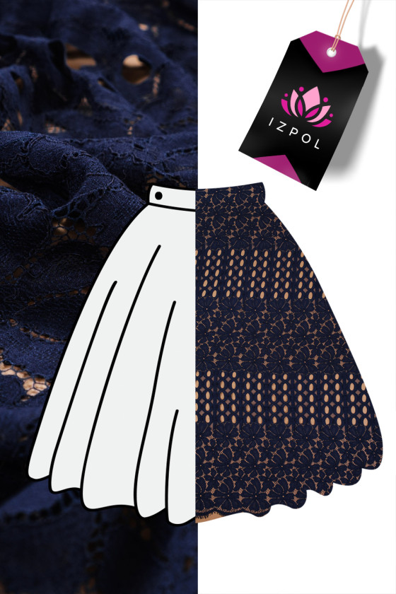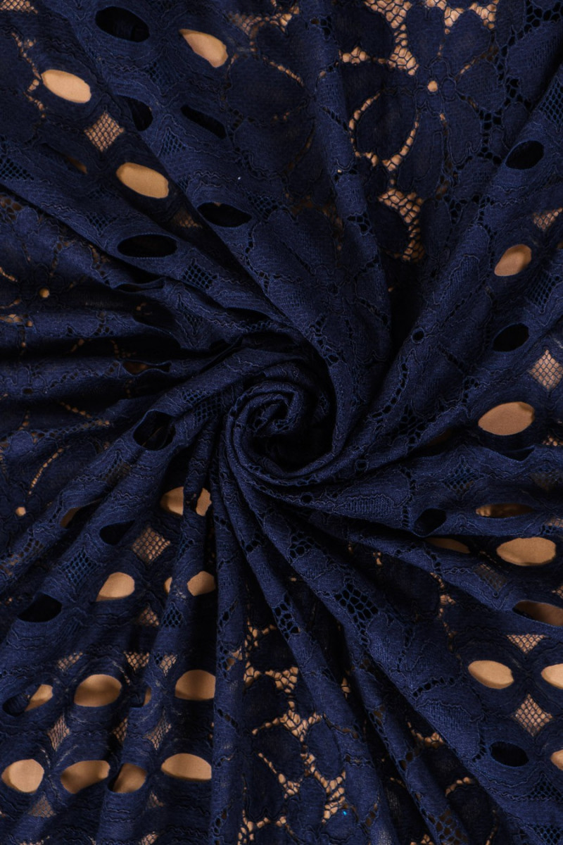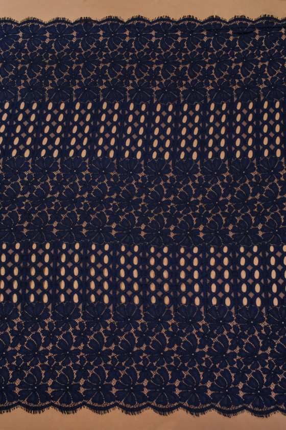 Piękna, granatowa koronka średniej grubości o niezwykłym układzie wzoru. Polecamy uszyć ją obwodowo.