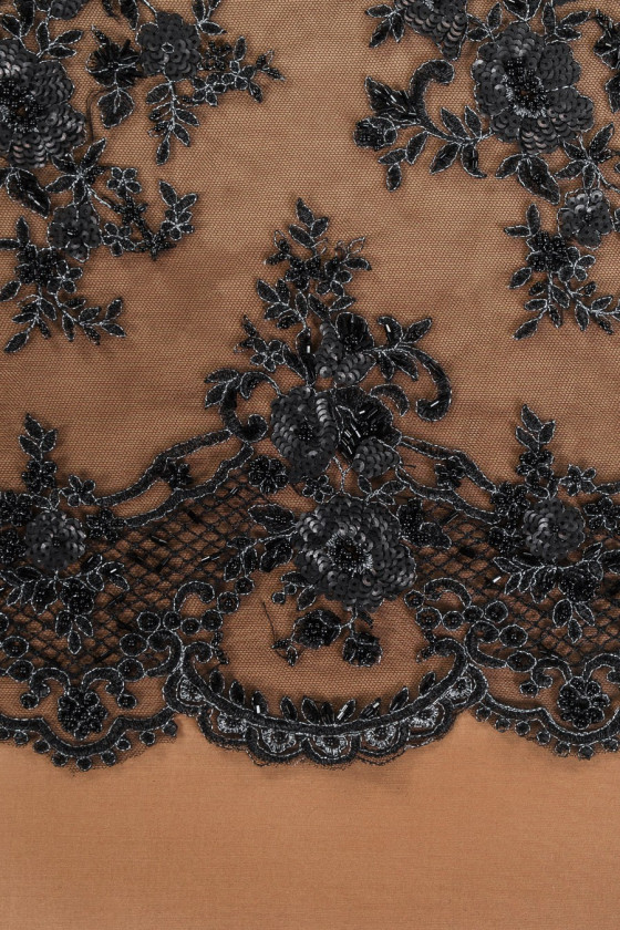 Piękna koronka w kolorze czarnym wyszywana cekinami i koralikami oraz obszyta srebrną nitką lureksową. Obustronnie wykończona zębem. Idealna na sukienkę wieczorową.