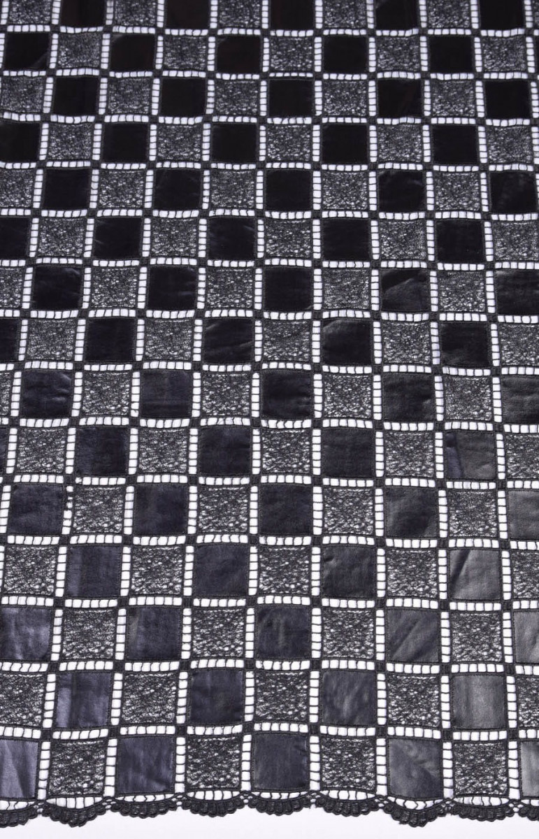 Koronka połączona jest z ekoskórą. Wzór szachownicy. Obustronnie wykończona zębem. Tkanina bardzo zjawiskowa.
