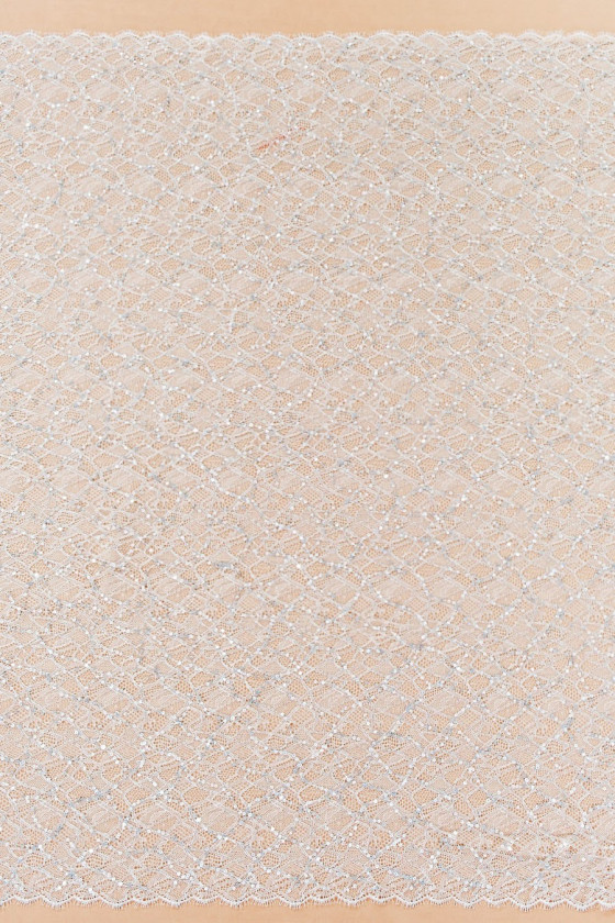 Cienka, delikatna koronka w kolorze szaro-srebrnym - wyszywana małymi cekinami multikolor i srebrną nitką lureksową. Tkanina o szerokości 80 cm - obustronnie wykończona zębem.