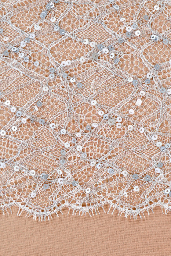 Cienka, delikatna koronka w kolorze szaro-srebrnym - wyszywana małymi cekinami multikolor i srebrną nitką lureksową. Tkanina obustronnie wykończona zębem. Idealna na sukienki lub bluzeczki
