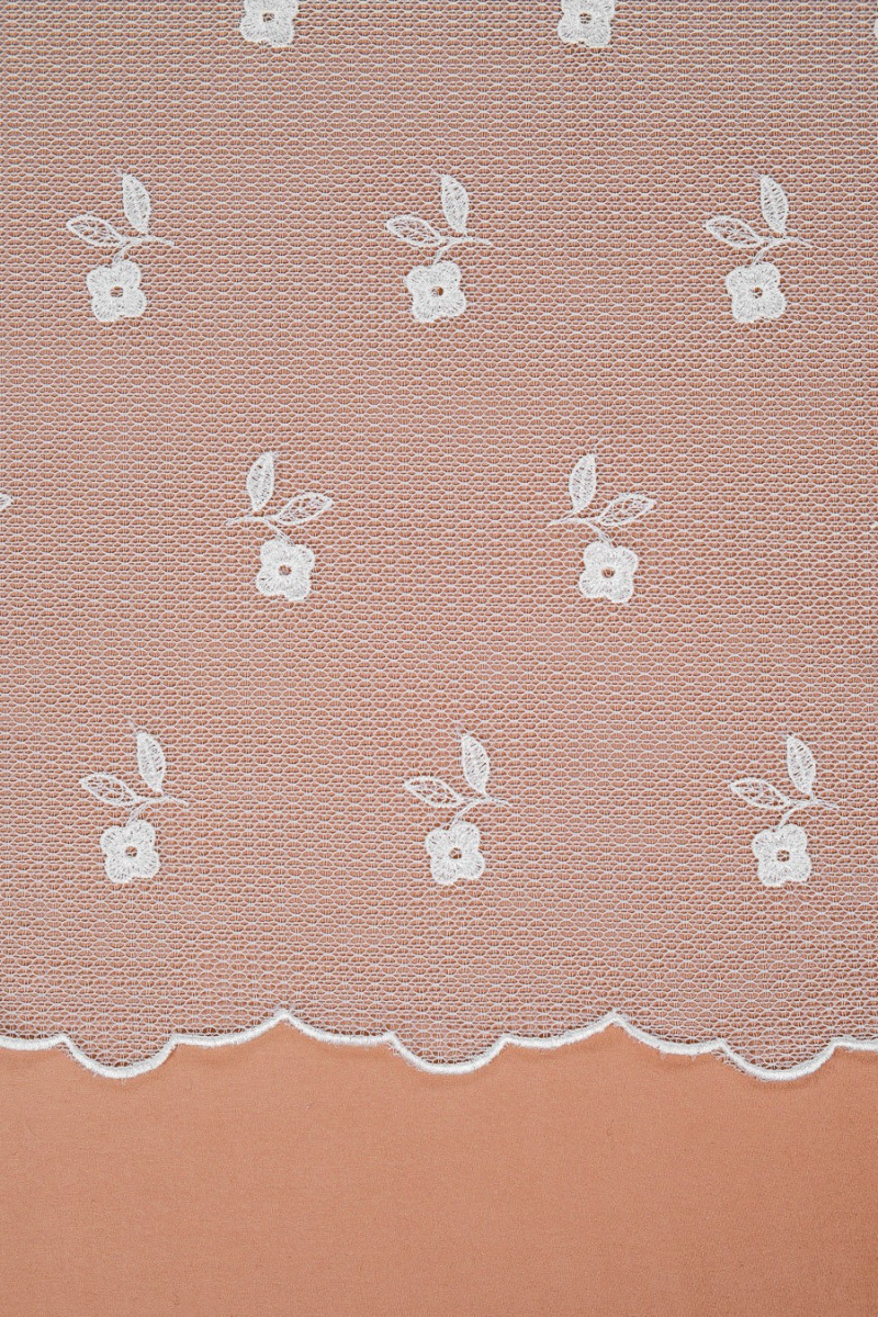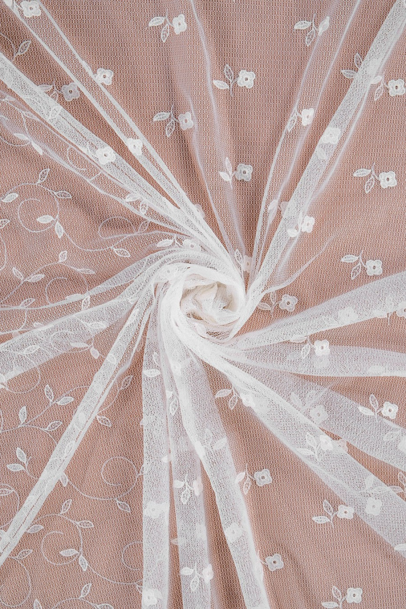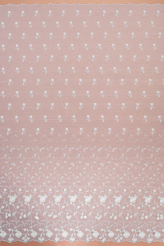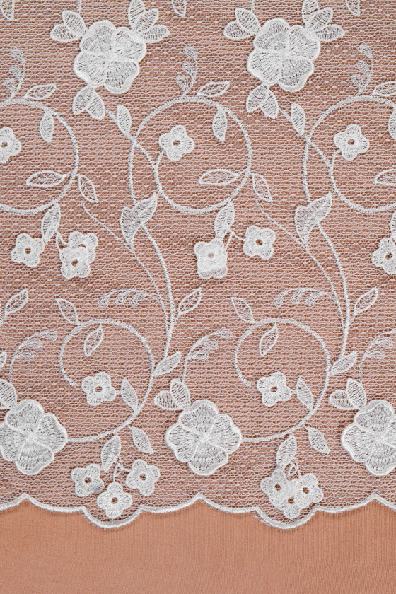 Piękna koronka z przeznaczeniem na sukienki ślubne lub bluzeczki. Tkanina z jednej strony wykończona szerokim zębem a drugiej strony obszyta ok 1 cm wykończeniem. Kwiatki tworzą efekt 3D.