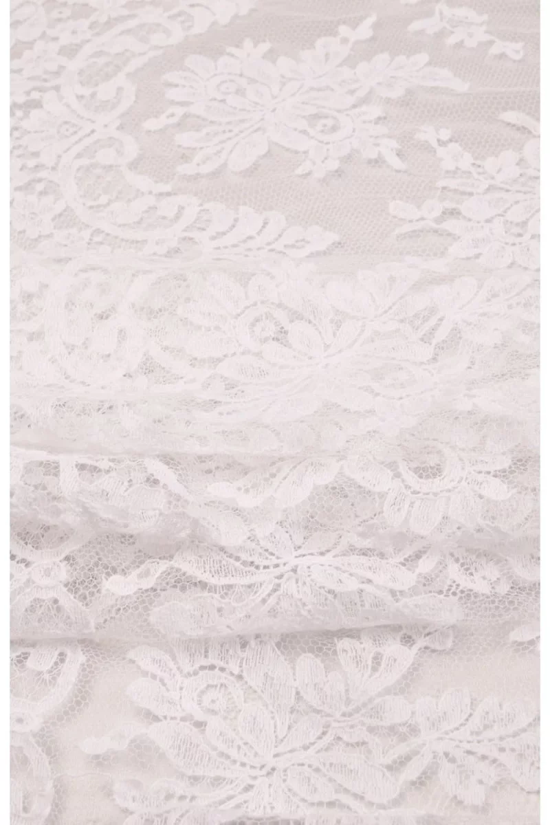 Ostatni kupon o wymiarach 125 cm * 90 cm koronki ślubnej o klasycznym, gęstym wzorze w kolorze białej śmietanki, obustronnie wykończony zębem. Koronka delikatna, miękka w dotyku.