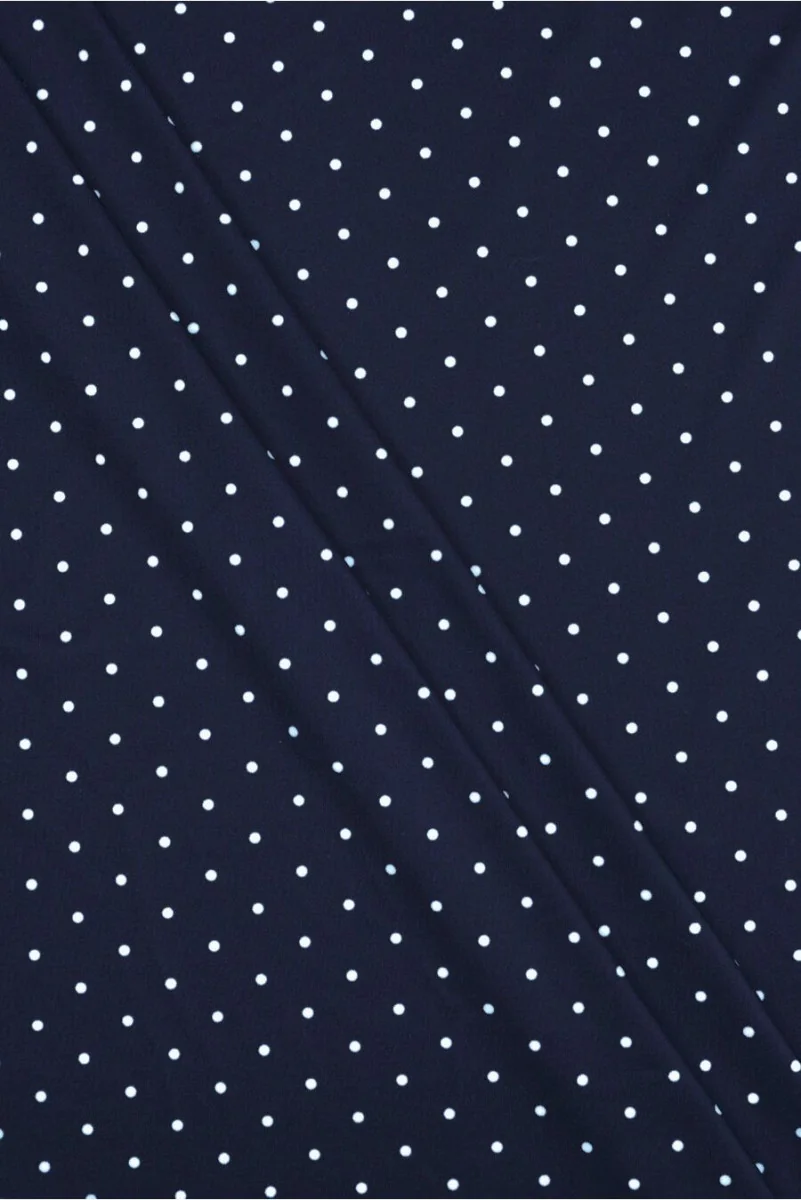 Dzianina elastyczna typu lycra w kolorze chłodnego granatu z motywem drobnych groszków. Wzór jest rozmieszczony symetrycznie a groszki mają wielkość 0,4cm. Tkanina o zwartym, ścisłym splocie, bardzo elastyczna - idealna dla osób lubiących dopasowaną do ciała odzież. Świetnie sprawdzi się do uszycia odzieży tanecznej a także stroju kąpielowego, gdyż jest wygodna, półmatowa i szybkoschnąca.