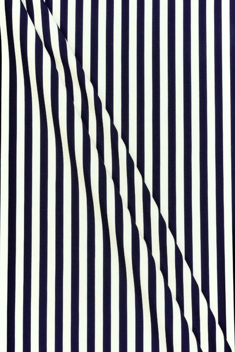 Dzianina elastyczna typu lycra z motywem pasków w kolorze ecru i bardzo ciemnego granatu. Wzór jest poziomy o szerokości 0,8cm a kolory ułożone naprzemiennie. Tkanina o zwartym, ścisłym splocie, bardzo elastyczna - idealna dla osób lubiących dopasowaną do ciała odzież. Świetnie sprawdzi się do uszycia odzieży tanecznej a także stroju kąpielowego, gdyż jest wygodna, półmatowa i szybkoschnąca.
