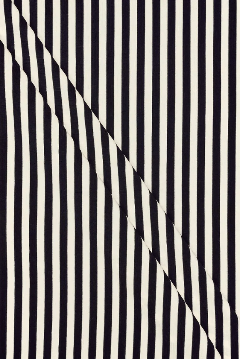 Dzianina elastyczna typu lycra z motywem pasków w kolorze ecru i bardzo ciemnego granatu. Wzór jest poziomy o szerokości 0,8cm a kolory ułożone naprzemiennie. Tkanina o zwartym, ścisłym splocie, bardzo elastyczna - idealna dla osób lubiących dopasowaną do ciała odzież. Świetnie sprawdzi się do uszycia odzieży tanecznej a także stroju kąpielowego, gdyż jest wygodna, półmatowa i szybkoschnąca.