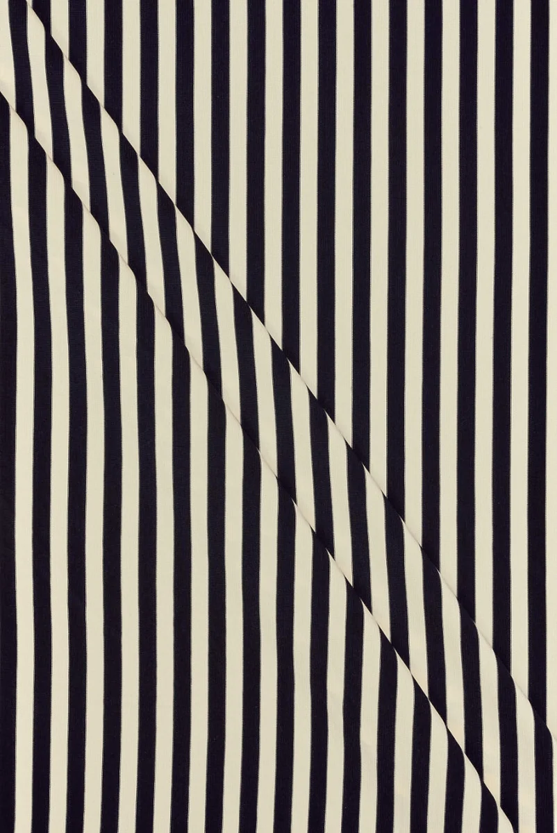 Dzianina elastyczna typu lycra z motywem pasków w kolorze ecru i bardzo ciemnego granatu. Wzór jest poziomy o szerokości 0,8cm a kolory ułożone naprzemiennie. Tkanina o zwartym, ścisłym splocie, bardzo elastyczna - idealna dla osób lubiących dopasowaną do ciała odzież. Świetnie sprawdzi się do uszycia odzieży tanecznej a także stroju kąpielowego, gdyż jest wygodna, półmatowa i szybkoschnąca.