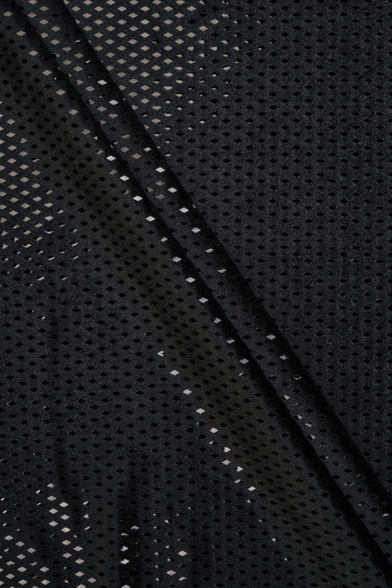 Welur elastyczny w czarnym kolorze ozdobiony małymi, czarnymi i błyszczącymi rombami. Figury mają rozmiar 4 mm * 6 mm. Tkanina jest miękka, bardzo elastyczna, kryjąca. Idealnie nadaje się do uszycia kreacji wieczorowych i imprezowych typu sukienki, spódnice, spodnie lub kostiumy.