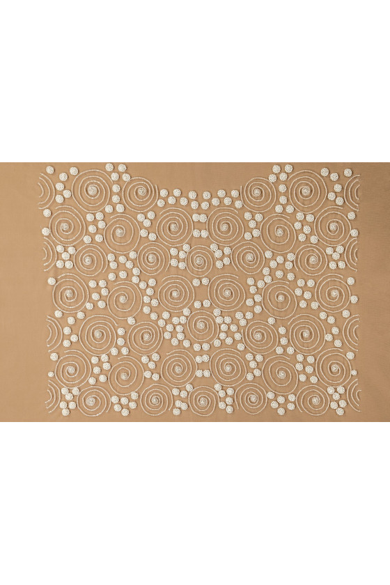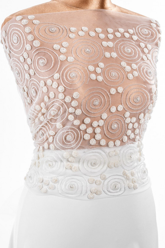Włoska aplikacja ślubna w formie gorsetu (bluzeczka - przód) w kolorze śmietanowym. Piękny motyw geometrycznych wzorów (6 cm) z przeźroczystych koralików, dopełniony drobniejszymi groszkami (1,5 cm) w kolorze perłowym. Całość jest naszyta na miękkim tiulu.
