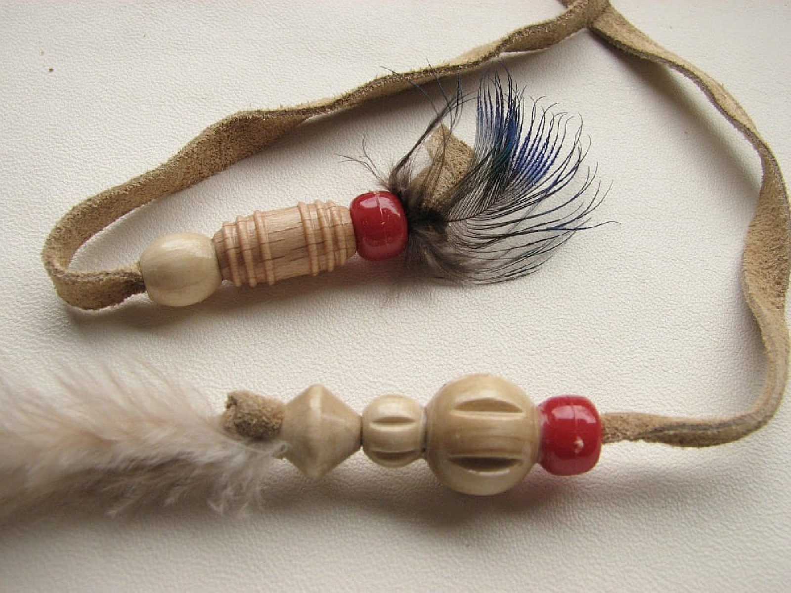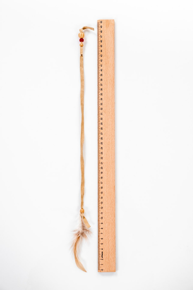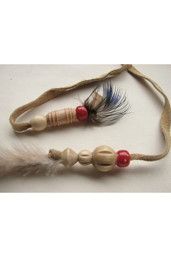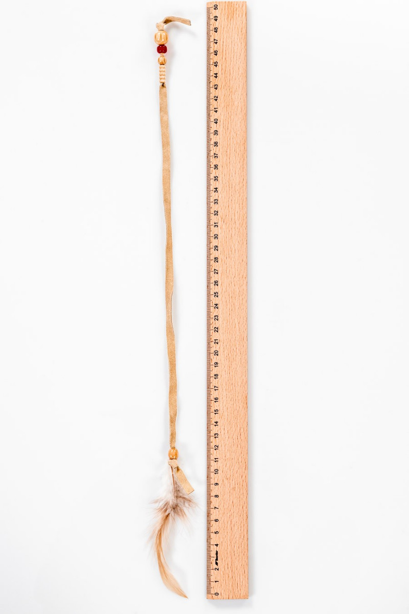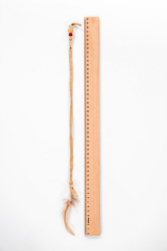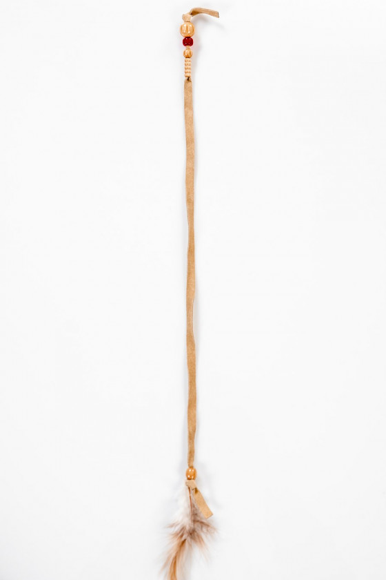Włoska aplikacja w formie rzemyka z beżowego zamszu z drewnianymi koralikami, zakończona naturalnym piórkiem.