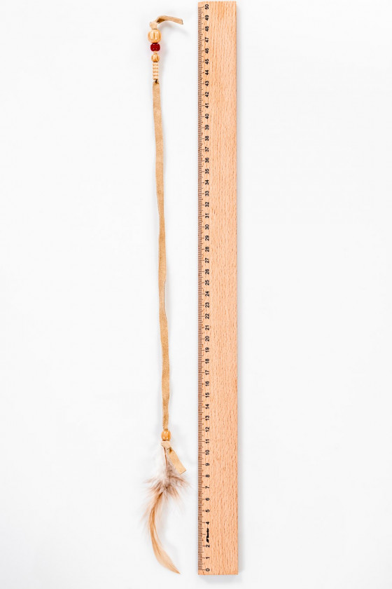 Włoska aplikacja w formie rzemyka z beżowego zamszu z drewnianymi koralikami, zakończona naturalnym piórkiem. Długość: 45 cm.