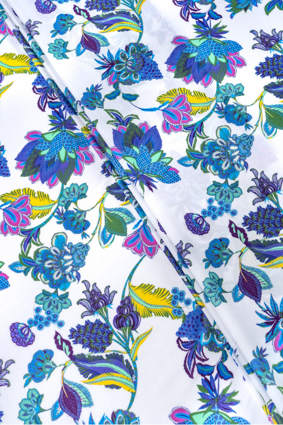 Włoska tkanina 100% bawełniana typu batyst w kolorze śmietanowym z kolorowym motywem kwiatowym.