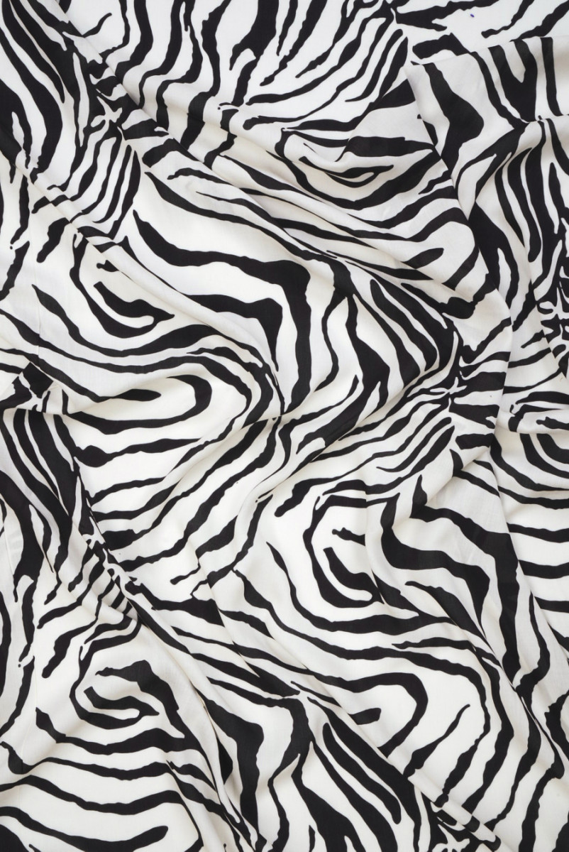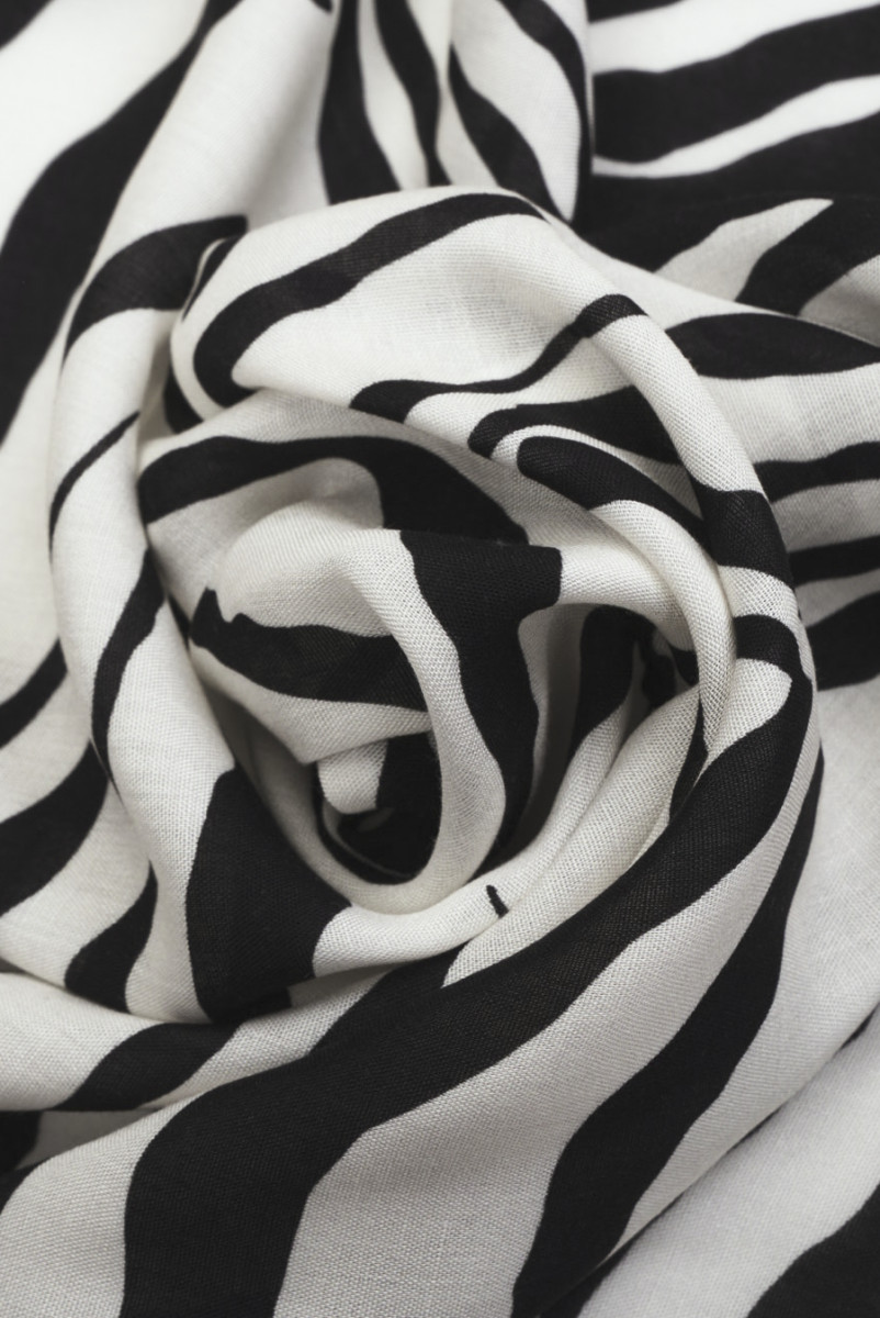 Włoska tkanina 100% bawełniana z motywem czarnej zebry na śmietankowym tle. Ponadczasowy zwierzęcy wzór w klasycznych kolorach. Tkanina o gładkim splocie, cienka, lekko transparentna, zwiewna i nieelastyczna. Idealnie nada się na bluzki, koszule, a także letnie sukienki i spódnice, do których zalecamy użycie podszewki.