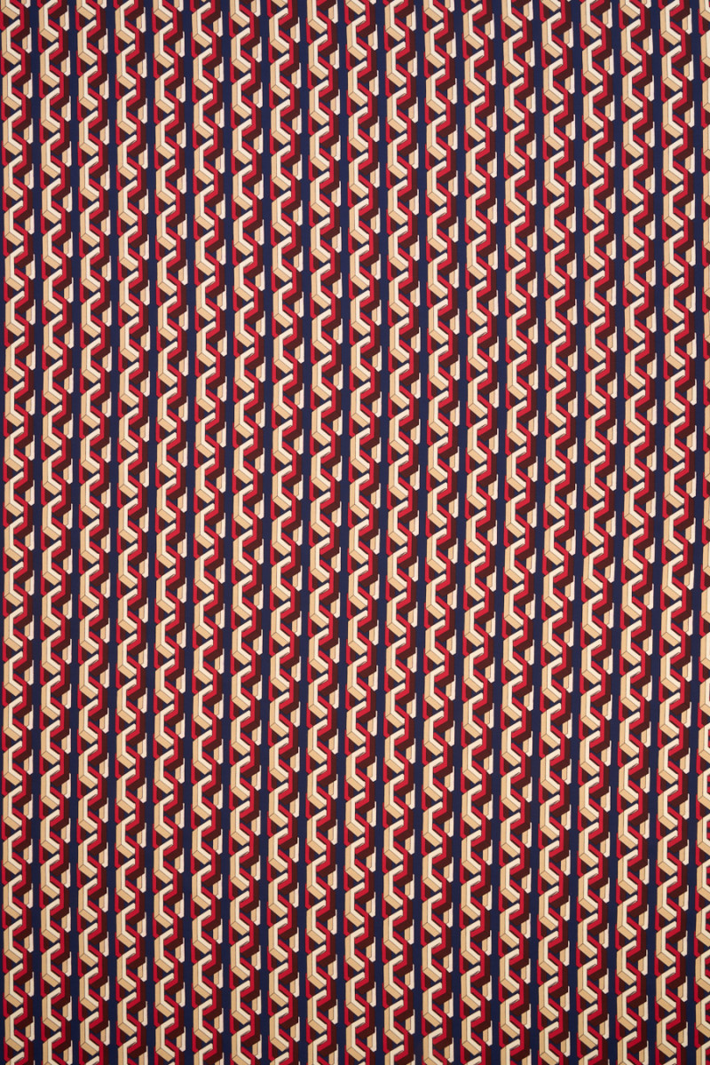 Włoska tkanina typu cadi utkana z mieszanki jedwabiu i poliestru z motywem czerwono beżowych łańcuchów na granatowym tle. Tkanina jest mięsista, nieelastyczna, lekko sztywno się układa. Interesująca propozycja z przeznaczeniem na spodnie, marynarki, szorty a także sukienki.