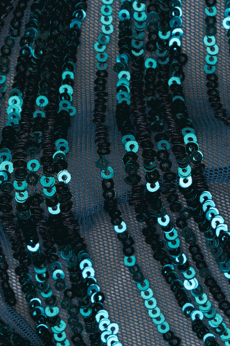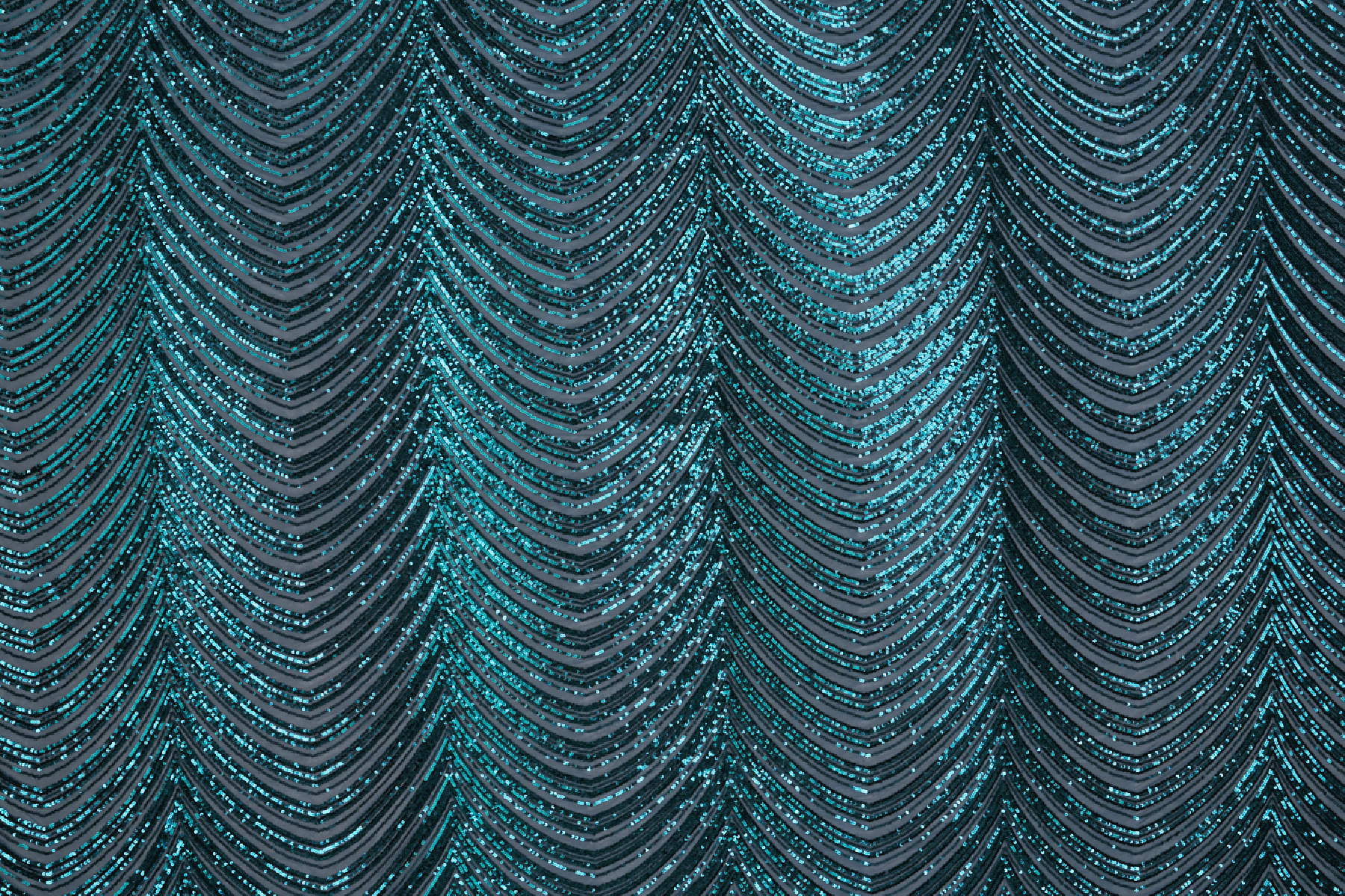 Włoska tkanina wieczorowa w bardzo eleganckim kolorze ciemnej zieleni. Tkanina jest wykonana z miękkiej siatki, elastycznej w dwie strony na którą naszyto błyszczące cekiny, które tworzą wzór fali lub jodełki - szyjemy ją obwodowo. Tkanina jest miękka, przeźroczysta, mocno elastyczna - przepiękna propozycja dla osób lubiących oryginalne wzory ale w klasycznym kolorze. Ciemna zieleń to kolor ponadczasowy, zawsze modny, dodaje szyku i elegancji każdemu fasonowi.