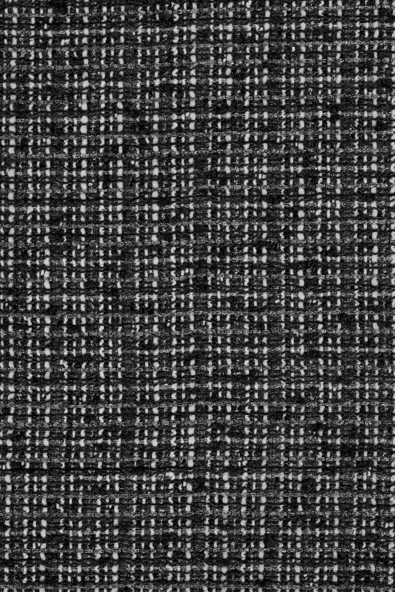Włoska tkanina kostiumowa typu chanel w kolorze szaro-śmietanowym ozdobiona srebrną nitką lureksową. Tkanina średniej grubości o delikatnie luźniejszym splocie.