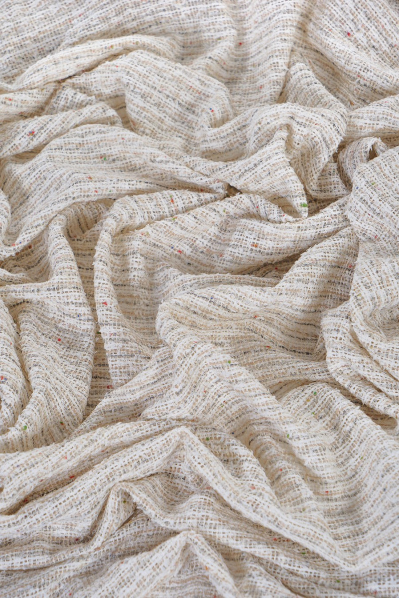 Tkanina sukienkowa o luźnym splocie niczym siatka z przeznaczeniem na wiosenne sukienki w kolorach śmietanki, bardzo jasnego beżu z delikatnymi , kolorowymi akcentami.