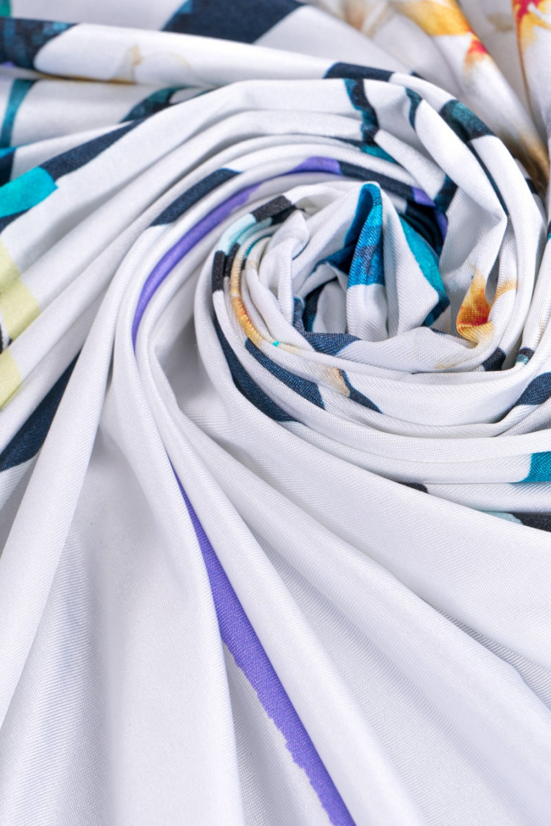 Włoska dzianina elastyczna typu lycra w kuponie o wymiarach 135 cm* 140 cm. Dzianina w kolorze białym z rosnącym, kolorowym wzorem kwiatowym, dół kuponu wykończony jest ozdobnym borderem o szerokości 35 cm. Tkanina o zwartym, gładkim splocie z efektem chłodzenia, bardzo elastyczna - idealna dla osób lubiących dopasowaną do ciała odzież i oryginalne motywy kwiatowe. Świetnie sprawdzi się do uszycia odzieży codziennej a także stroju kąpielowego lub plażowego parea, gdyż jest wygodna i szybkoschnąca.