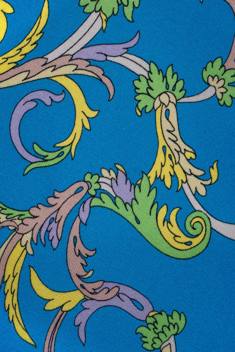 Włoska dzianina wiskozowa typu jersey w kolorze niebieskim z motywem zielono-żółtych, orientalnych motywów. Tkanina typu jersey to dzianina kryjąca, miękko układająca się, którą można uszyć bez podszewki.