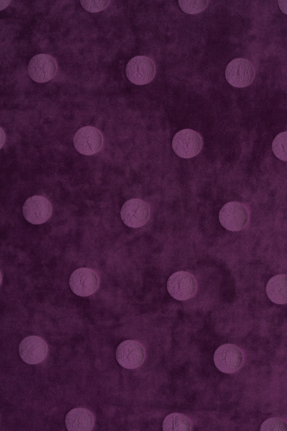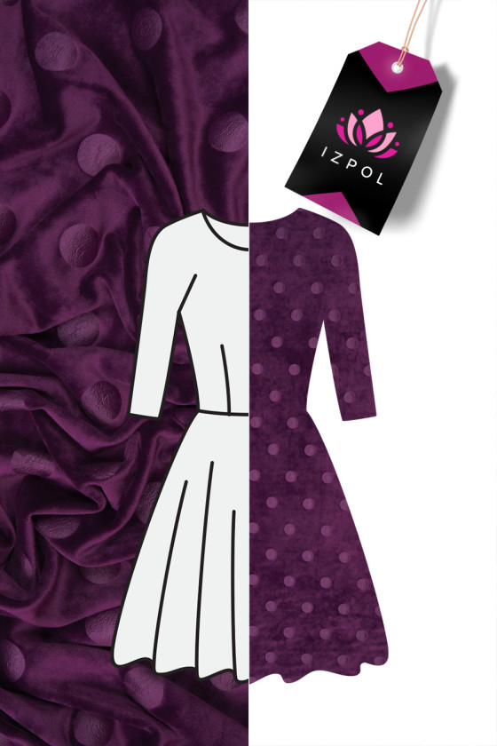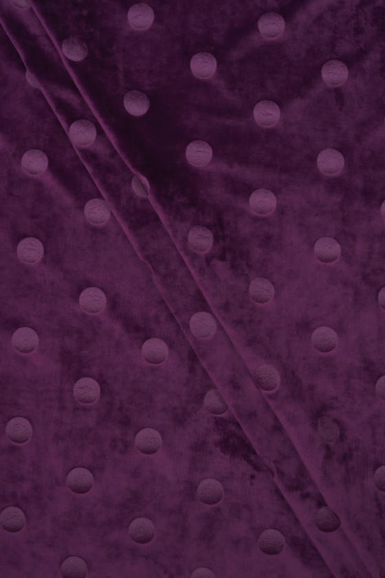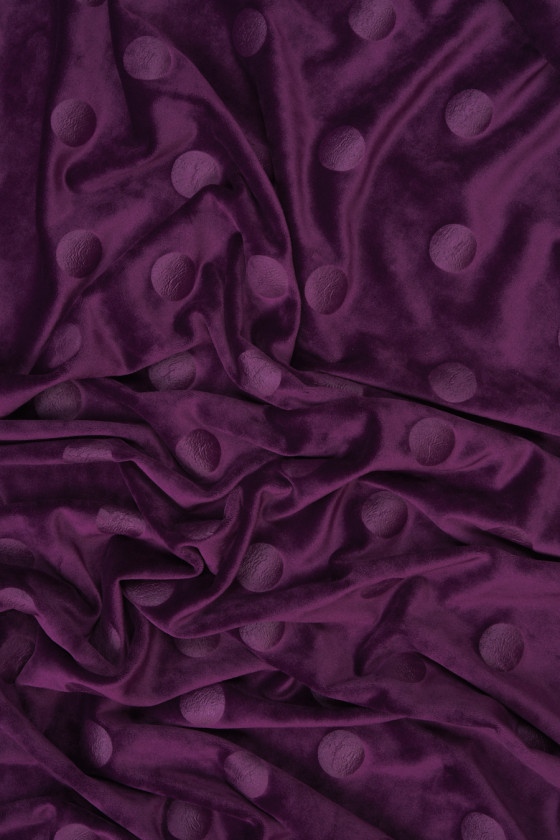 Włoska dzianina welurowa w kolorze fioletowym z motywem dużych grochów (2,5 cm). Dzianina elastyczna, mięsista z charakterystycznym, krótszym włosem. Idealna do uszycia bluzki, bluzy, sukienki lub spodni.