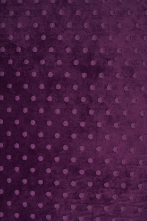 Włoska dzianina welurowa w kolorze fioletowym z motywem dużych grochów (2,5 cm). Dzianina elastyczna, mięsista z charakterystycznym, krótszym włosem.