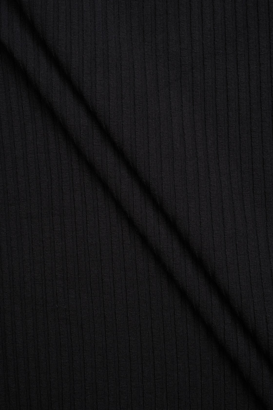 Włoska dzianina o szerokim splocie ściągaczowym (0,5 cm) w kolorze czarnym. Dzianina miękka, bardzo elastyczna, kryjąca, przyjemna w dotyku - idealna do uszycia sukienki, spódnicy, bluzeczki.