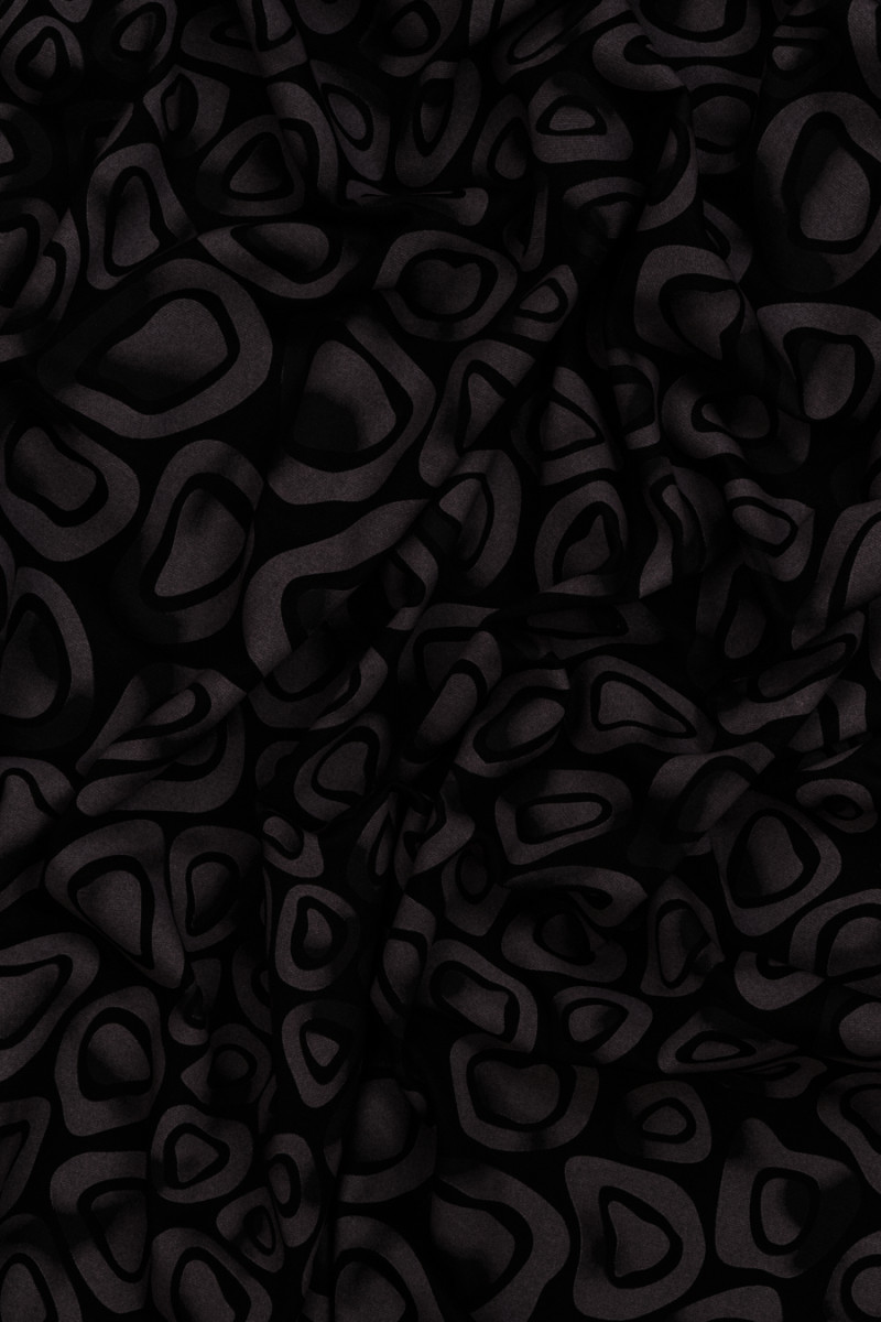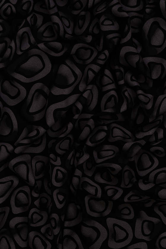 Włoska dzianina typu jersey w kolorze czarnym z motywem szarych, geometrycznych wzorów przypominających łatki o wielkości ok 6 cm. Dzianina typu jersey to dzianina kryjąca, miękko układająca się, którą można uszyć bez podszewki. Świetnie nadaje się na codzienne sukienki, spódnice, marynarki.