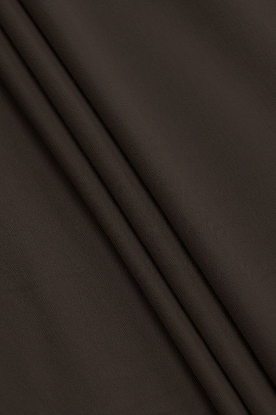 Włoski jersey poliestrowy w kolorze ciemnego brązu. Dzianina o lekko luźnym splocie. Jest średniej grubości, matowa i elastyczna. Doskonale sprawdzi się w uszyciu codziennych ubrań, takich jak sukienki, spódnice, tuniki czy narzutki.